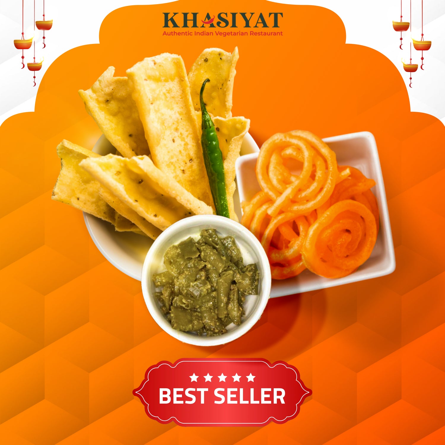 From the crisp bite of fafda, the golden swirls of jalebi dessert, to the spicy tang of pickles near me, this Khasiyat combo captures the essence of Indian desserts and homestyle flavors loved by generations.
