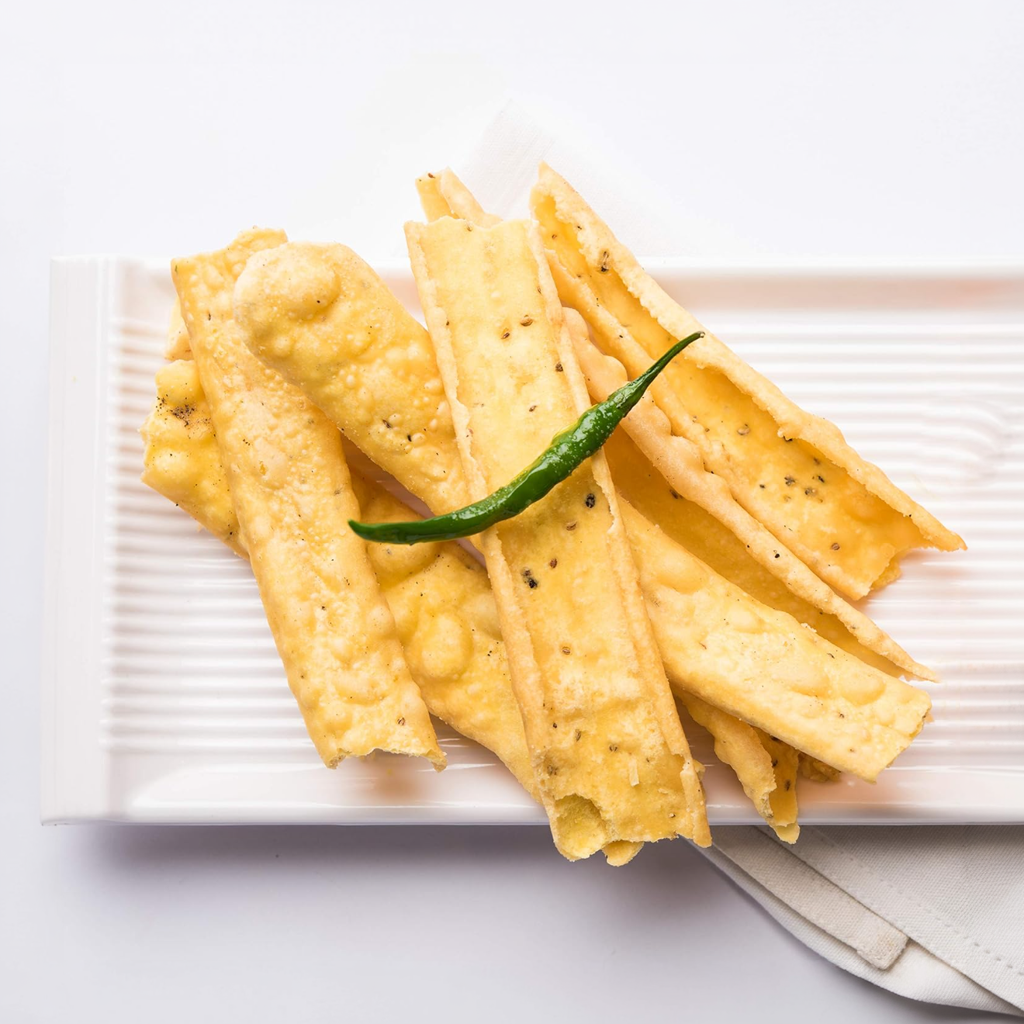 Fafda: Ingredients: Chickpea Flour, Baking Soda, Salt, Asafoetida (Hing), Ajwain, OilGross Gross Weight: 200g